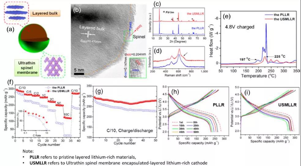 電極材料已被用作正極包覆材料。通常,應(yīng)將較穩(wěn)定的材料涂覆在較不穩(wěn)定的材料上,以提高材料的整體穩(wěn)定性和性能。好處在于,它們?cè)谡龢O和電解質(zhì)之間提供了物理阻擋層,抑制了副反應(yīng),改善了電荷轉(zhuǎn)移動(dòng)力學(xué),使正極材料具有更好的電化學(xué)性能。然而,很難實(shí)現(xiàn)均勻且薄的電極材料包覆。而且,需要較高的熱處理溫度以形成良好的包覆,可能導(dǎo)致正極材料分解。對(duì)于這類包覆,需要選擇最佳的包覆材料和包覆條件。例如,超薄尖晶石(LiMn2O4)包覆的富鋰Li1.2Mn0.6Ni0.2O2層狀氧化物(USMLLR)改善了電化學(xué)和熱性能。好處是既保證了富鋰層狀氧化物材料的高容量又提供了較高的倍率性能,同時(shí)由于LMO優(yōu)異的Li+電導(dǎo)率而改善了表面處的電荷傳輸。